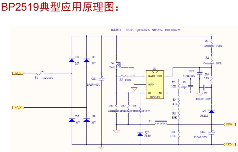 BP2519的典型应用原理图展示了芯片在电源管理系统中的核心位置。原理图中,BP2519通过其GND、GATE、CS、FB和VCC引脚与外部电路相连,实现电流采样、电压反馈和驱动控制。电感、电容和电阻等元件与芯片协同工作,形成稳定的电源输出。