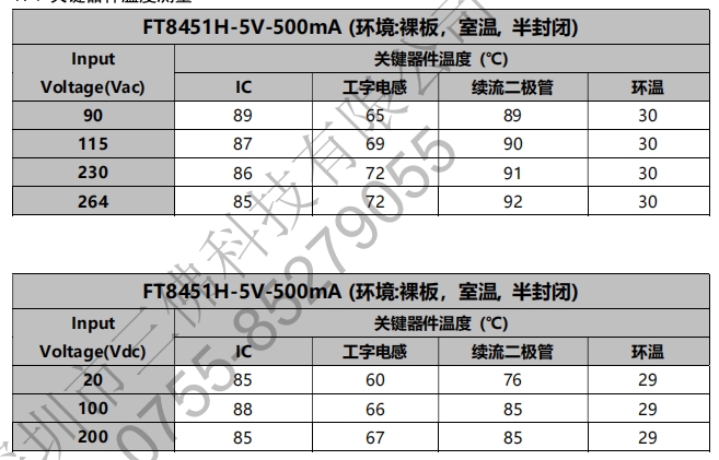 效率与电压稳定性:在不同输入电压下,FT8451H均能保持较高的效率和稳定的输出电压。例如,在90Vac输入时,满载效率为65%,输出电压稳定在5V左右;在230Vac输入时,满载效率同样达到65%,输出电压也保持稳定。
