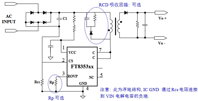 在该电路中,AC输入电压经过整流滤波后,为FT8353xx芯片供电。VCC脚接收供电电压,CS脚通过Rcs电阻采样电感电流,实现恒流控制。ROVP脚根据需要设置输出过压?;ぁND脚连接到VIN电解电容负端,为芯片提供稳定的参考地。C脚与变压器相连,将功率传输到次级侧,为LED负载提供驱动电压和电流。此外,电路中还可选配RCD吸收回路,用于抑制变压器漏感引起的电压尖峰,?;ば酒偷缏返奈榷ㄔ诵小?/p>