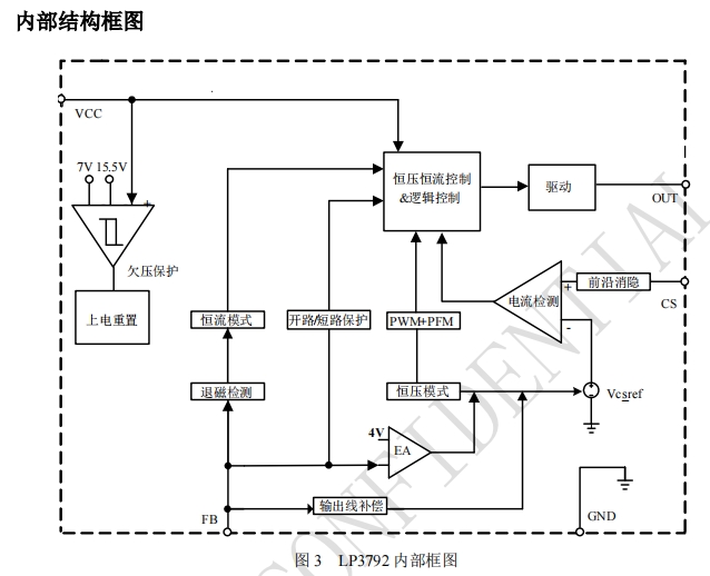 在恒压模式下,LP3792通过采样辅助绕组的平台电压,并与内部基准电压进行比较,形成闭环控制,从而精确调节输出电压。其恒压精度高,能够确保输出电压在各种输入电压和负载条件下的稳定性。在恒流模式下,芯片逐周期检测电感的峰值电流,并通过CS端与内部阈值电压进行比较,当达到设定阈值时关断MOS管,实现精确的恒流控制。这种高精度的控制方式对于需要严格控制充电电流的设备,如手机、平板电脑等,至关重要,能够有效?;さ绯?,延长其使用寿命。