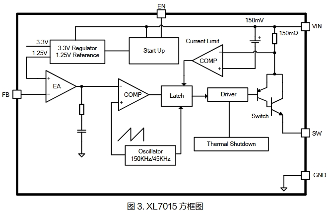 XL7015是一款高效、高压降压型DC-DC转换器,固定150KHz开关频率,可提供最高0.8A输出电流能力,低纹波,出色的线性调整率与负载调整率。XL7015内置固定频率振荡器与频率补偿电路,简化了电路设计。PWM 控制环路可以调节占空比从0~90%之间线性变化。内置输出过电流?;すδ?,当输出短路时,开关频率从150KHz降至45KHz。内部补偿??榭梢约跎偻馕г骷?。内部框架图如下~