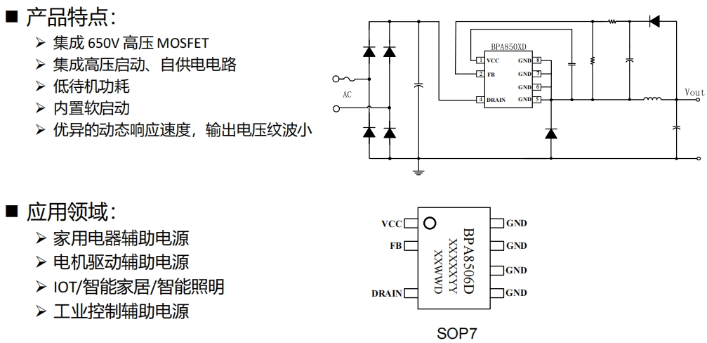 BPA8506D是一款集成了650V高压MOSFET的高性能电源管理芯片,专为满足家用电器、电机驱动、物联网设备以及工业控制等领域的辅助电源需求而设计。它不仅具备高压启动和自供电功能,还实现了低待机功耗、优异的动态响应速度以及低输出电压纹波等特性,极大地提升了电源系统的整体性能。