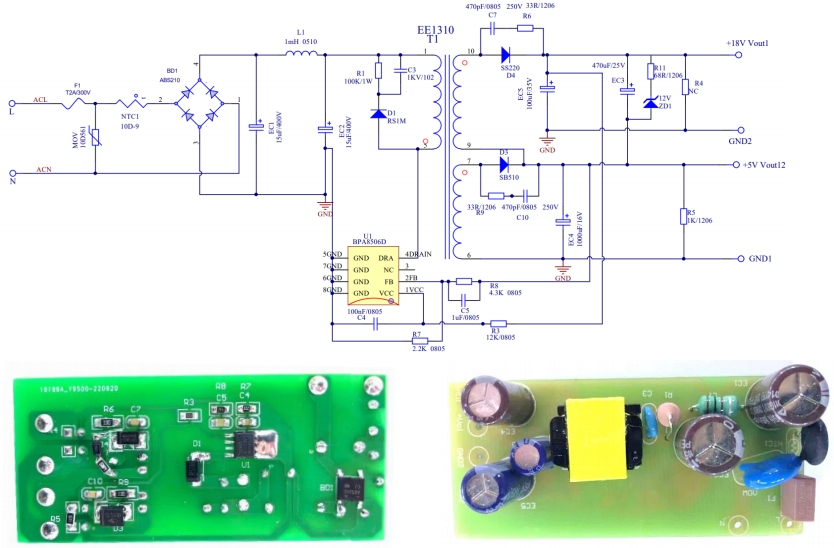 BPA8506D参考设计的电路图和实物图展示了其简洁而高效的布局。通过合理选择元件和优化电路结构,该设计实现了高性能与高可靠性的平衡。例如,采用EE1310磁芯的变压器,其初级绕组感量为950uH±7%,漏感量小于30uH,确保了高效的能量传输和稳定的输出电压。此外,电路中还配备了多种?;せ?,如短路?;?、过流保护等,进一步提升了系统的安全性。