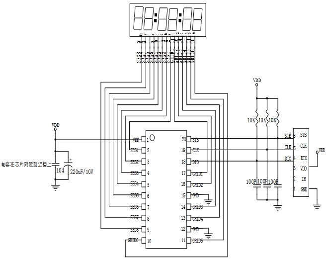 GRID1至GRID6引脚连接到LED显示屏的位驱动端,用于控制显示屏的位显示。