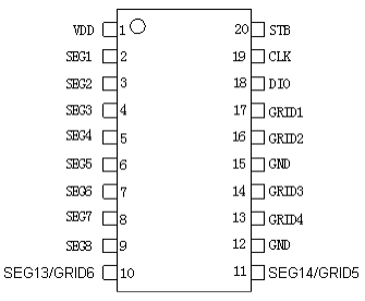 AIP1620芯片采用SOP20封装,具有20个引脚,每个引脚都有明确的功能定义。例如,VDD引脚为逻辑电源输入,SEG1至SEG8为段输出引脚,GRID1至GRID6为位输出引脚,DIO引脚用于串行数据输入/输出,CLK引脚为时钟输入,STB引脚用于片选和初始化。这些引脚的合理布局和功能设计,使得AIP1620能够与外部电路无缝连接,实现高效的信号传输和控制。