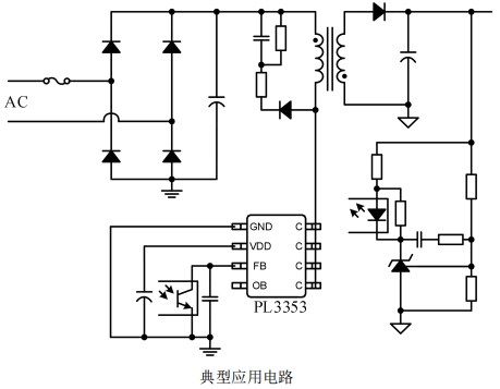 176Vac~264Vac电压输入、副边反馈的隔离电源。PL3353内部集成了700V功率开关、高压启动电路和电流采