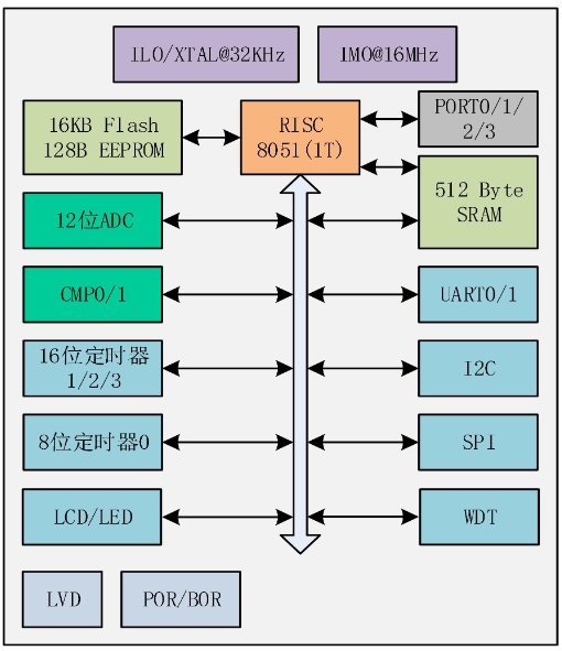 采用1T 8051内核,时钟频率最高可达33MHz,同时具备低功耗模式,动态功耗低至0.18mA/MHz。