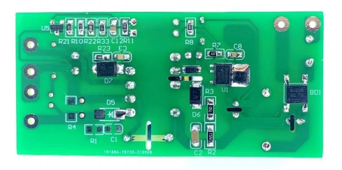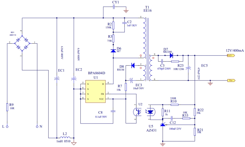 BPA8604D的电路设计简洁而高效,充分体现了其高度集成化的特点。从电路图中可以看出,整个电源电路主要由输入滤波、整流桥、变压器、反馈电路和输出滤波等部分组成。输入滤波部分采用了电解电容和贴片电容的组合,能够有效滤除输入电压中的高频噪声,为后续电路提供稳定的输入电压。