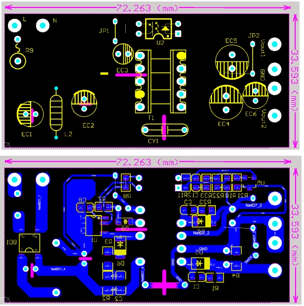 实物图展示了BPA8604D电源??榈慕舸战峁购图蚪嗖季?。整个电路板采用了单面板设计,尺寸仅为72mm×33.5mm,适合安装在空间有限的设备中。电路板上的元件布局合理,走线清晰,便于生产制造和维修。通过实物图,我们可以直观地感受到BPA8604D电源模块的高效能和可靠性,其简洁的设计理念和精湛的制造工艺,使其成为了现代电源设计的典范之作。