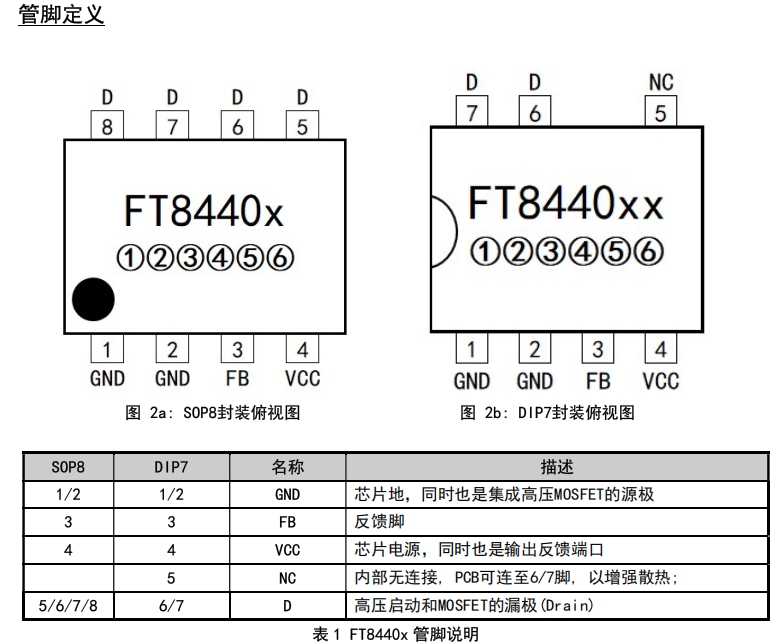 了解管脚功能是正确使用FT8440A系列与FT8440B系列的基础。以下是两种封装形式的管脚定义: