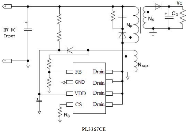 PL3367CE具有低启动电流,可以采用大的启动电阻以及小的VDD电容以降低应用中的功率损耗。其工作电流很低,再加上特有的复合模式控制,从而提高了系统的效率,特别是系统处于轻载条件下。
