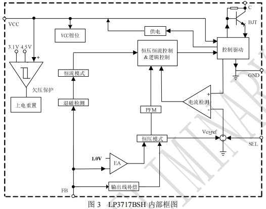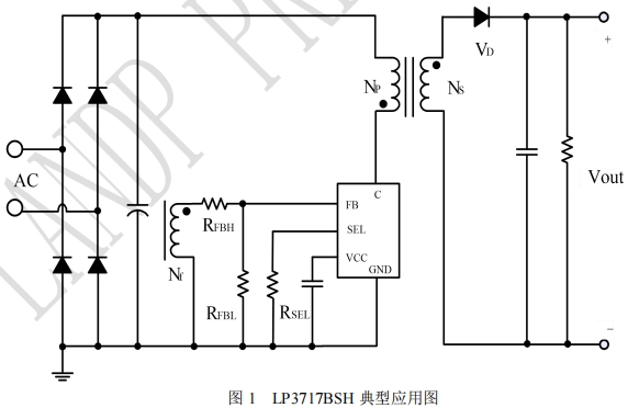 LP3717BSH 通过外置电阻,可调原边峰值电流,再通过变压器原副边匝比来设置输出恒流点;通过设定 FB 上偏电阻和下偏电阻来设置输出恒压点。为了实现系统成本的极致简化,LP3717BSH 内置启动电路,外围不需要启动电阻;采用自供电的方式来取消辅助绕组 VCC 供电二极管。