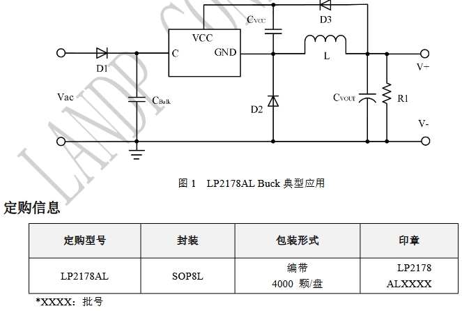 LP2178AL是一款专为非隔离Buck和Buck-Boost拓扑结构设计的高效率、高精度恒压控制驱动芯片。它适用于85VAC~265VAC的全范围输入电压,特别适合小家电和白色家电等电源驱动场景。该芯片内部集成了750V高压功率管,采用恒压控制模式,能够工作在连续导通模式(CCM)和不连续导通模式(DCM)。通过特有的PFM(脉冲频率调制)控制方式,LP2178AL能够显著改善音频特性,同时内置峰值电流控制,无需外部CS电阻,简化了外围电路设计。