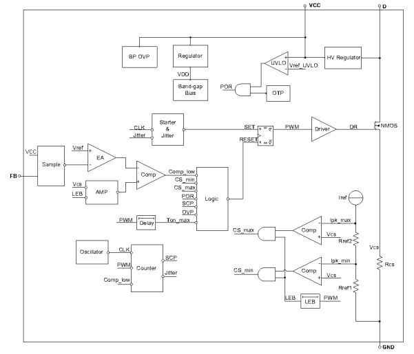 FT8440E内部集成了高压启动电路,起机时间较快,典型值为50ms。芯片起机或重启期间,负载电流请控制在额定电流的80%以内,以免芯片无法正常起机。起机完成后,可以正常带载额定电流。内部框架图如下所示~