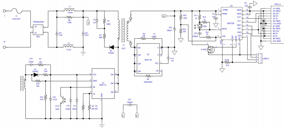 在当今快速发展的电子设备市场中,电源适配器的性能和效率对于设备的稳定运行至关重要。随着USB-C接口和USB-PD协议的广泛应用,市场对高性能、高效率的电源适配器的需求日益增加。本文将详细介绍基于BP87112和BP6211B芯片的20W A+C电源适配器参考设计,该设计支持12V/1.67A、9V/2.22A和5V/3A的输出规格,旨在为用户提供一个高效、可靠的电源解决方案。