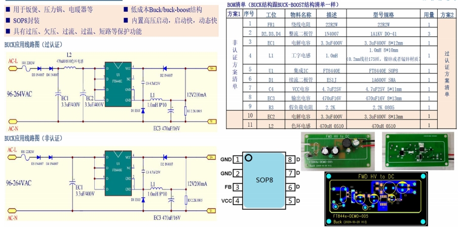 FT8440E芯片SOP8封装,用于饭煲、压力锅、电暖器等低成Buck/buck-boost结构,内置高压启动,启动快,动态快具有过压、欠压、过流、过温、短路等保护功能。