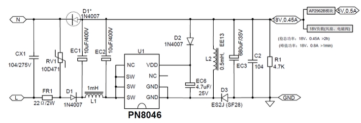 PN8046芯片的典型应用包括18V/0.45A智能家电电源方案。该方案基于双路18和5V,输出非隔离开关电源,使用Chipown设计研发的离线式集成电源控制芯片PN8046。输入电压范围为90~265V,输出功率≤8.1W,输出电压为18V,输出电流为0.45A,效率高达78%。