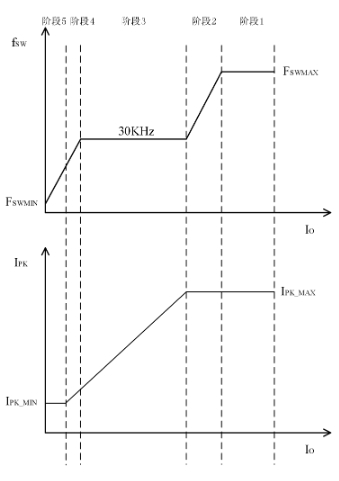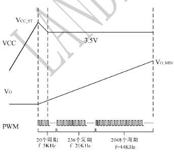 通过启动电路给VCC电容充电,VCC达到启动电压VCC_ST,芯片输出PWM开关信号。此时输出电压开始上升,因输出电压还小,VCC电压会下降到3.5V,VCC通过自供电维持在3.5V。PWM开关信号经过以下3个阶段,软启动结束。软启动结束时,输出电压上升到VO_MIN:若VO_MIN>3.5V,芯片正常工作;若VO_MIN<3.5V,芯片输出短路?;ぁ?/p>