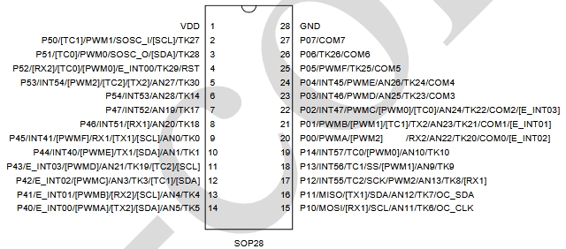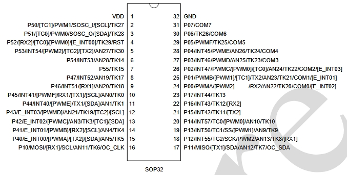 AiP8F3532 提供了多种封装形式,包括 SOP32、SOP28、LQFP32 和 QFN32 等,以满足不同用户的需求。以下是其中几种封装形式的引脚排列图: