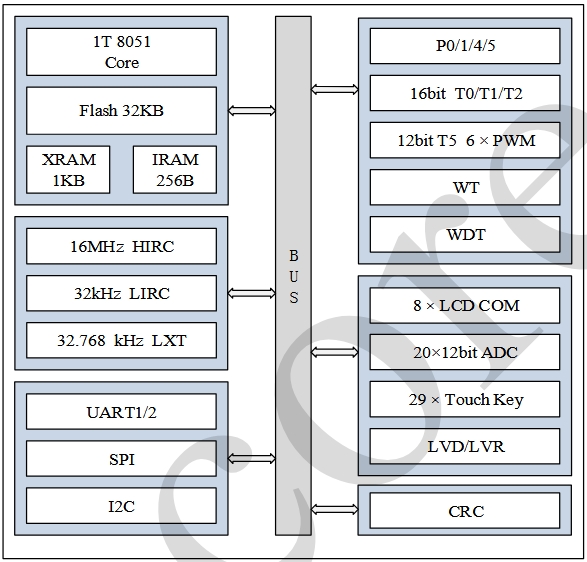 时钟系统:芯片内置 16MHz 的高速振荡器(HIRC)和 32kHz 的低速振荡器(LIRC),同时支持外部低速晶振(LXT)输入,最高可达 32.768kHz。这些时钟源为系统提供了灵活的时钟选择,以适应不同的工作模式和功耗要求。