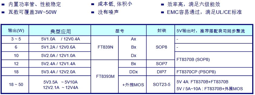 FT839xx/FT8393xx系列芯片是专为满足DoE(美国能源部)和CoC(欧洲协调委员会)六级能效标准而设计的AC-DC恒压恒流芯片。该系列芯片内置功率管,具备性能稳定、成本低、体积小、效率高等特点,能够覆盖3W~50W的瓦数范围,广泛适用于各种电子设备的充电器和适配器设计。