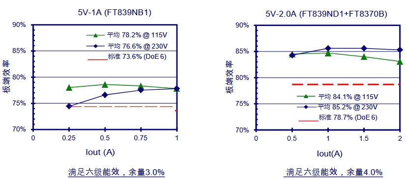 FT839xx/FT8393xx系列芯片在设计上充分考虑了能效优化,能够轻松满足DoE和CoC六级能效标准。以FT839NB1为例,在115V和230V输入电压下,其平均效率分别达到了78.2%和76.6%,远高于标准要求的73.6%,且余量达到了3.0%。这意味着在实际使用中,该芯片不仅能够高效地将电能转换为设备所需的能量,还能在不同负载条件下保持稳定的能效表现。