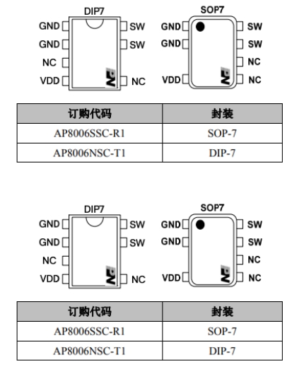 AP8006采用SOP-7封装形式,这种封装方式具有体积小、散热性能好等优点,适合在紧凑的电路板上使用。在订购时,用户可以根据实际需求选择不同的封装形式和规格型号。例如,AP8006SSC-R1是其中一种型号,适用于小家电电源芯片IC。