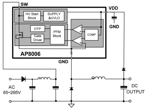 AP8006是一款专为小功率非隔离开关电源设计的芯片,它集成了PFM控制器及650V高雪崩能力智能功率MOSFET,能够有效减少外围元器件的使用,简化电路设计。该芯片内置高压启动???,可实现系统的快速启动和稳定的待机功能。此外,AP8006还具备智能化的?;すδ?,包括过载?;?、欠压?;ず凸卤;さ?,确保了电源系统的安全可靠运行。其降频调制技术有助于改善EMI特性,使产品在电磁兼容性方面表现出色。