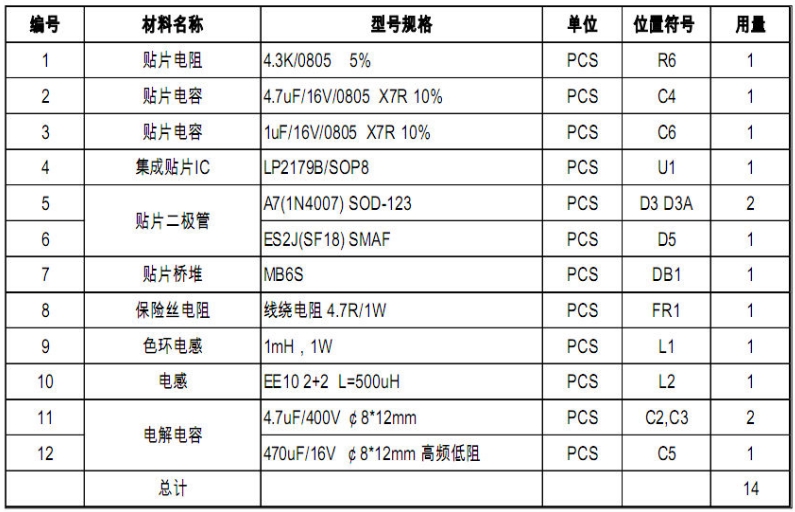 该电源方案的 BOM 表详细列出了所需的各种元件及其规格和用量。其中包括贴片电阻、贴片电容、集成贴片 IC、贴片二极管、贴片桥堆、保险丝电阻、色环电感、电感、电解电容等。这些元件均为高品质的电子元件,能够确保电源的稳定性和可靠性。通过合理的元件选择和用量控制,该方案在保证性能的同时,也具有较高的性价比。