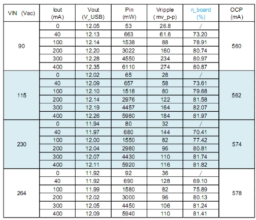 测试报告详细记录了该电源方案的各项测试数据和结果。在纹波、调节和效率测试中,其纹波电压在不同输入电压和负载条件下均能够保持在较低水平,表现出良好的输出稳定性。在效率方面,随着输入电压的升高和负载的增加,其效率也相应提高,最高可达 82.07%,显示出较高的能量转换效率。