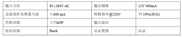 该电源方案的输入电压范围为 85~264V AC,能够适应不同国家和地区的电网电压,具有广泛的适用性。其输出规格为 12V 400mA,能够为自动卷发器提供稳定的电源。