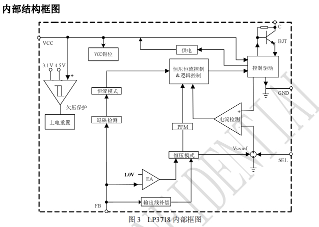 在设计上,LP3718BSL采用了极简化的外围电路。它内置启动电路,无需外部启动电阻,同时采用自供电技术,取消了辅助绕组VCC供电二极管。这些设计不仅降低了系统成本,还提高了系统的可靠性和效率。内部框架图如下所示~
