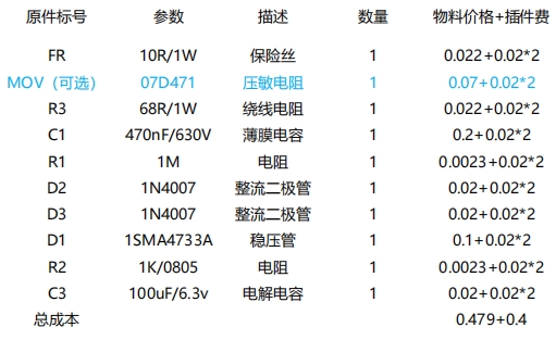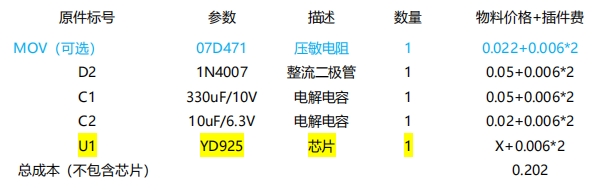 从 BOM 方案及成本来看,YD925 方案的物料种类大幅减少,且大多为贴片元件,尺寸小,可实现全贴片加工,极大地降低了生产成本和体积。以一个典型的 5V 输出供电方案为例,YD925 的外围电路简洁明了,主要包括压敏电阻(可?。?、整流二极管、电解电容等常见元件,总成本(不包含芯片)仅为 0.202 元,相比传统阻容降压方案的 0.479+0.4 元,成本优势不言而喻。