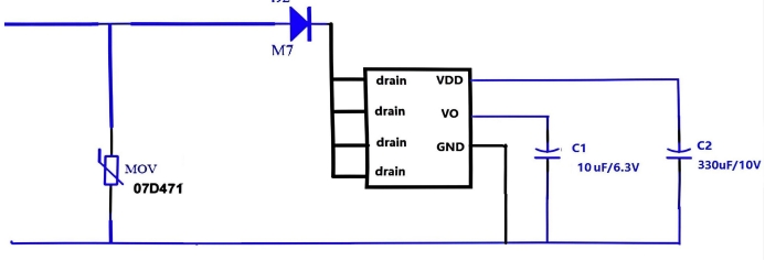 在这样的背景下,YD925 线性稳压方案应运而生,以其独特的设计和优势,完美解决了传统阻容降压方案的诸多问题。原理图如下所示