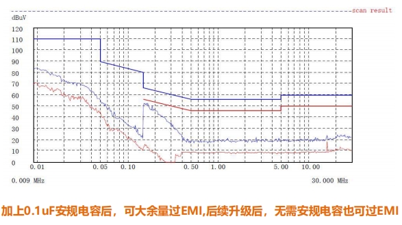 在实际应用中,布板的合理性和电磁兼容性(EMI)测试是电源设计中不可忽视的重要环节。YD925 的布板示例表明,其电路布局简洁明了,元件排布紧凑合理,不仅节省了 PCB 空间,还便于生产制造和后期维护。在 EMI 测试方面,YD925 的表现同样出色。经过测试,YD925 供电方案在加上 0.1uF 安规电容后,可大余量过 EMI。而且,后续升级后,无需安规电容也可过 EMI,这无疑为产品的设计和认证提供了极大的便利,进一步降低了产品的设计成本和复杂度。