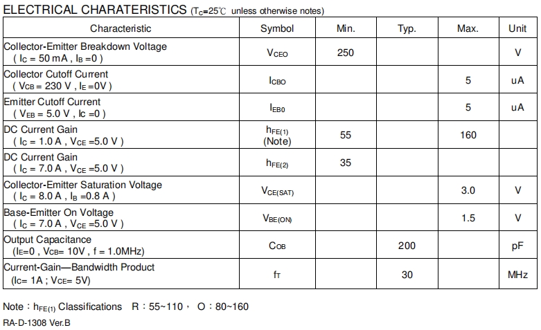 集电极 - 发射极饱和电压(VCE(SAT)):在集电极电流为8.0A,基极电流为0.8A时,VCE(SAT)的最大值为3.0V。较低的饱和电压意味着在晶体管导通时,能量损耗较小,从而提高了功率放大器的效率。