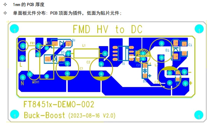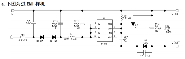 在电路原理图中,可以看到FT8451B的输入端通过一个电感L1与高压输入相连,电感L1的作用是储能和滤波,能够有效平滑输入电流,减少电流的波动。同时,一个色环电阻FR1与电感L1串联,起到限流和保护的作用,防止输入电流过大对芯片和电路造成损坏。在输出端,一个工字型电感L2与芯片相连,其感量为0.22mH,这个电感在电路中起到关键的储能和电流调节作用,确保输出电流的稳定。此外,多个电解电容和陶瓷电容分布在电路中,用于滤波和稳定电压,进一步提高电源的输出质量。
