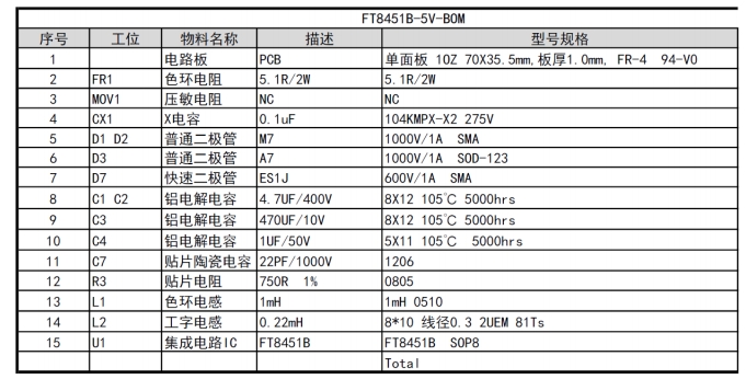 FT8451B的物料清单简洁明了,主要包括以下几个关键元件: