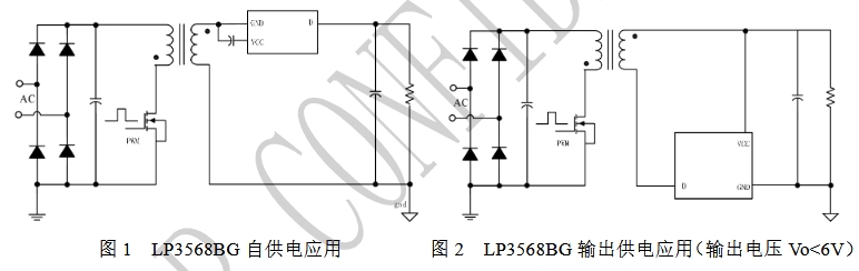 在自供电应用中,LP3568BG通过其D脚连接输出电压,利用内置MOS的体二极管对输出电容充电,实现自供电启动。当VCC电压达到开启阈值时,芯片内部控制电路开始工作,MOS管正常导通和关断,电流从MOS管的沟道流过,而非体二极管,从而实现高效的同步整流。这种应用方式适用于需要简化电路设计、减少外部电源依赖的场景。