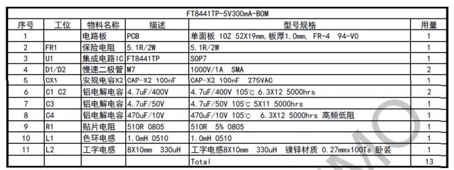 FT8441TP 是一款专为小家电辅助电源设计的高性能非隔离式开关电源芯片,能够提供高精度、高效率的恒压输出。本文将详细介绍基于 FT8441TP 的 5V300mA 电源芯片 DEMO 板的参考设计,涵盖其特点、电源规格、电路原理图、PCB 布局以及物料清单等关键信息。