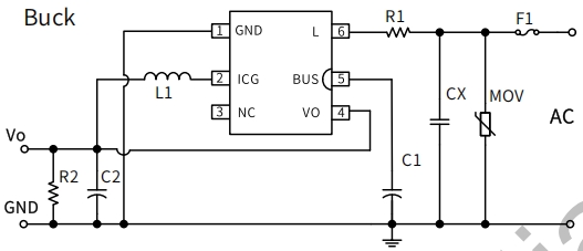 BUS(管脚 5):内置整流桥二极管的阴极,连接到母线电容的正端。该管脚为高压启动电路和自供电电路提供了电源输入,并确保母线电压能够稳定地为芯片供电。