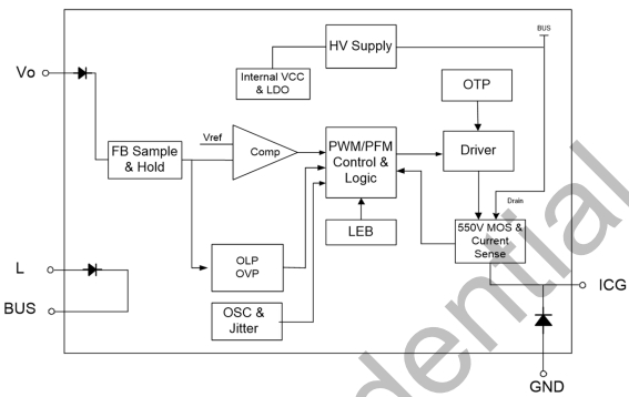 ICG(管脚 2):芯片地,同时也是内置 MOSFET 的源极和内置续流二极管的阴极。该管脚为芯片的内部控制电路提供了接地参考点,并确保 MOSFET 能够正常导通和关断。