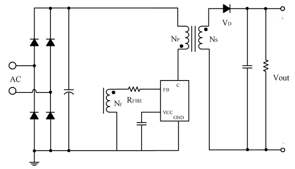 该系列芯片内置启动电路,无需外围启动电阻,同时内置FB下偏电阻,固定峰值电流来实现取消限流电阻,并采用自供电方式取消辅助绕组VCC供电二极管,极大地简化了系统成本。