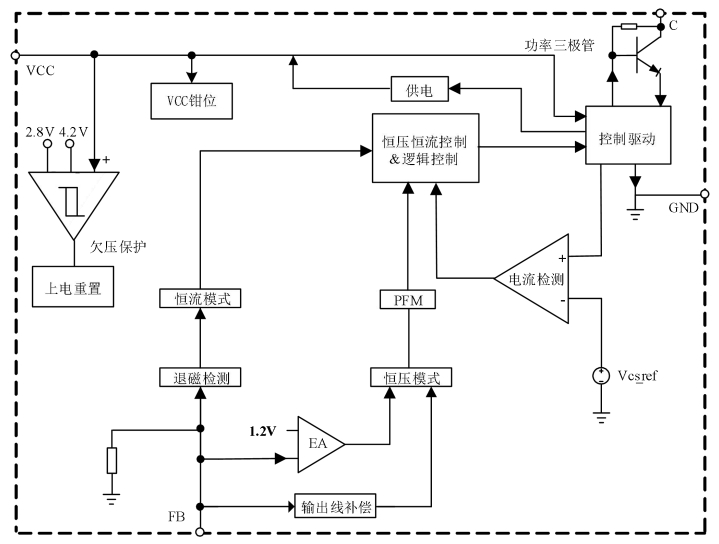 3667系列芯片的内部框架图揭示了其高度集成的设计理念。如图3所示,芯片内部集成了功率三极管、VCC供电电路、恒压恒流控制逻辑、欠压?;?、电流检测、上电重置、退磁检测等功能???。这种高度集成的设计不仅减少了外围元件的数量,还提高了系统的可靠性和稳定性。