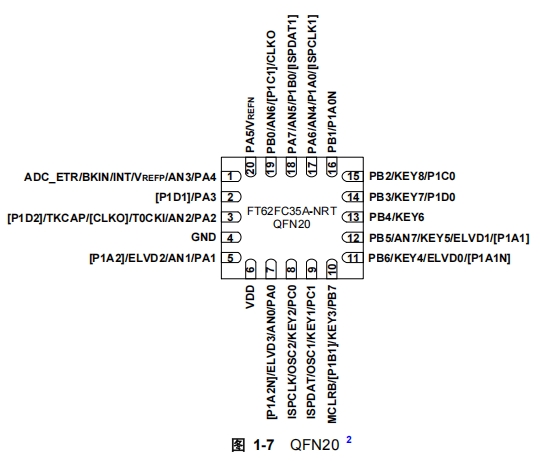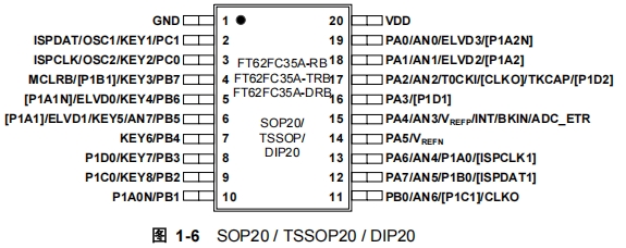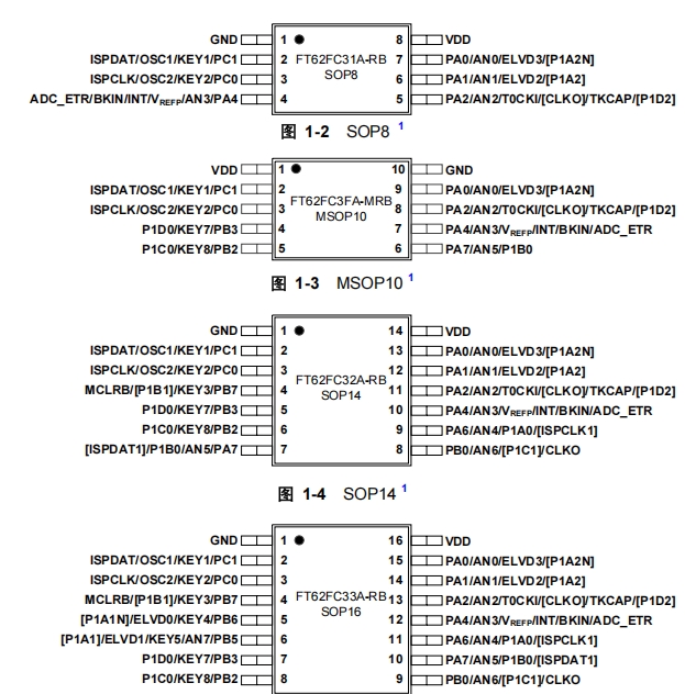 FT62FC6X系列微控制器根据不同的封装类型和功能需求,提供了多种引脚配置。以下是结构框图及一些常见的引脚及其功能介绍: