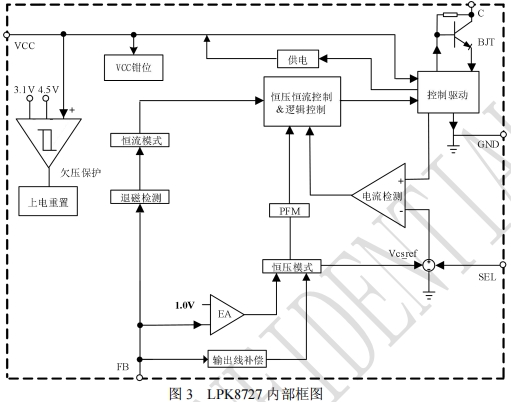 LPK8727仅需1uA的启动电流。系统上电后,通过内部启动电路给Vcc的电容充电,当Vcc电压达到芯片开启阈值时,芯片内部控制电路开始工作。系统启动后,Vcc由内部专有的供电电路进行供电。
