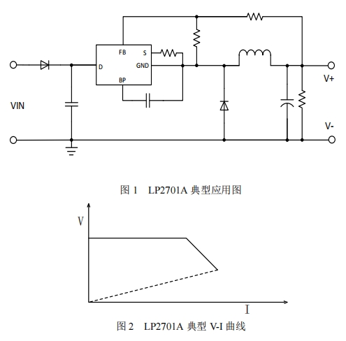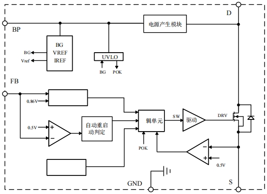 集成500V高压功率管,无需外部启动电阻和辅助绕组供电,简化外围电路;