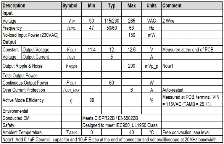 适配器在不同输入电压和负载条件下,均能提供稳定的12V输出电压。测试报告显示,在90Vac/50Hz和264Vac/60Hz的输入条件下,输出电压的波动范围极小,保证了连接设备的稳定运行。