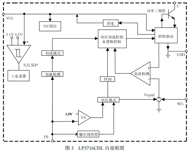 该框图展示了芯片的主要功能???,包括功率三极管、VCC供电电路、恒压恒流控制电路、保护功能电路等。通过这些??榈男ぷ?,LP3716CDL能够实现高效的电源管理和精确的输出控制。
