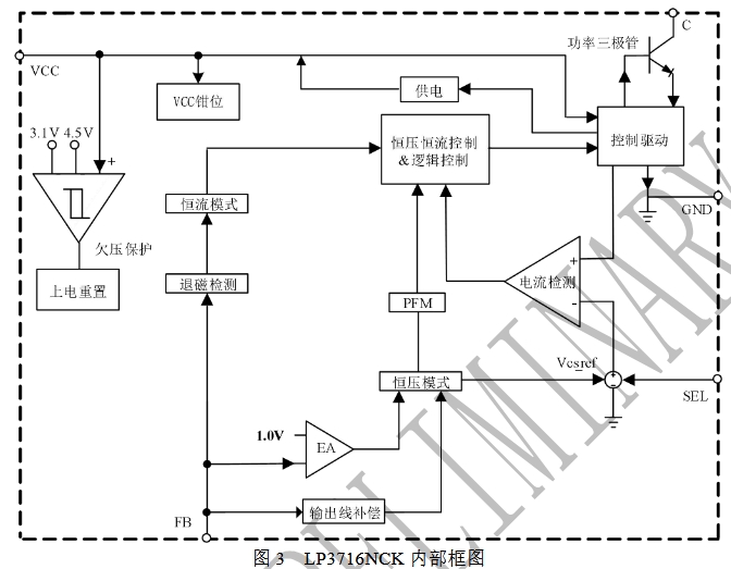 LP3716NCK芯片在设计和应用中展现出诸多显著优势。首先,其极简化的外围设计大幅减少了外围元件数量,降低了系统成本和设计复杂度。其次,芯片的低待机功耗特性使其在节能方面表现出色,特别适合应用于对能效要求较高的设备中。LP3716NCK内部框架图如下所示